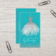 Elegante vestimenta costurera tarjeta de visita, con gráficos de un vestido purpurina blanco y plateado, con un fondo turquesa, con acentos purpurinas plateados. Personalice el texto para adaptarlo a sus necesidades empresariales. Una preciosa tarjeta para tu negocio de sastrería.