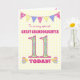 Una tarjeta de cumpleaños número 11 de bonito para tu bisnieta, con un racimo de puntos de polka, flores de primrose y números rellenos con un patrón de primrose, todo en un fondo de gingham amarillo pálido. El mensaje de la portada es: "¡A un GRANDDAUGHTER 11 HOY!" El mensaje interno es sólo una sugerencia y puede personalizarlo o eliminarlo fácilmente si lo prefiere.