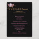 Creado con una tarjeta de 110 libras semi-brillante para una impresión fotográfica óptima, este hermoso giro en una tarjeta de programa de almuerzo clásico está esperando que usted lo personalize con su propia información. Tiene esquinas redondeadas para un aspecto elegante y todo negro para una aventura elegante. El texto se hace en color marrón claro-dorado y rosado y cuenta con una huella de corona rosa y plateado brillante en la esquina superior izquierda. Un toque agradable para tu brunch de premios también. Debe personalizar este elemento. Elija estilos de texto y colores, etc. Habitación en la parte trasera para personalizar con información adicional.