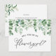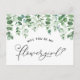 Pide a tus amigos y familiares que sean parte de tu boda con esta tarjeta floral "¿Serás mi dama de flores?" que presenta eucalipto acuarela con letra de caligrafía femenina. Artículos coincidentes están disponibles. Tarjeta de propuesta para la fiesta de bodas