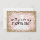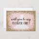 Glitter de oro rosa con fondo sonrosado y vestido de novia sirena dibujado por nosotros. Dice "¿serás mi dama de flores?"