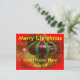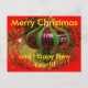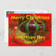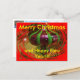 Una Bombilla de Navidades rojos y verdes se disparó en un árbol de Navidad. Con un marco rojo que es brillante y colorido que está en una TARJETA DE POST para NAVIDADES!!!