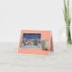 Una escena conmovedora que presenta una tarjeta de Navidad doblada apoyada contra un fondo blanco liso. La tarjeta representa una clásica aldea navideña nevada por la noche, con cabañas iluminadas, un árbol de Navidad decorado y Papá Noel en su trineo tirado por renos cruzando un puente de piedra. El texto de la tarjeta dice "Deseándote una Navidad alegre" y "Que tus días estén llenos de calidez, amor y alegría". A la derecha de la tarjeta hay una taza blanca humeante de cacao o café caliente y dos galletas de hombre de jengibre. El fondo es blanco puro, creando un aspecto limpio y aislado de estudio.