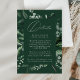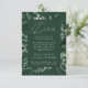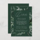 Elegante boda botánico con detalles de tarjetas con detalles escondidos en un marco rectangular rodeado de eucaliptos, helechos y otros ricos paisajes sobre un fondo verde oscuro. Añade detalles como alojamiento en el hotel, información de recepción de bienvenida, sitio web del boda, etc. Diseñado para coordinar con nuestra colección Abundant Greenery boda.