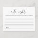 Esta tarjeta de ideas nocturnas de la noche de la fecha incluye un delicado tipo de letra manuscrita y un moderno diseño minimalista. 💜 Colores editables! Haga clic en la opción 'hacer clic en más personalizar' para cambiar los colores para que coincidan con el tema. Este juego es perfecto para una ducha nupcial, una ducha en pareja o un momento boda.