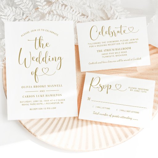 Gold Heart Script Wedding Invitation SuiteDiseñado por Kat Fusinski