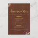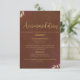 Ayude a los huéspedes a disfrutar de una celebración sin estrés con esta cálida tarjeta de envoltura de boda de terciopelo de terracota. Diseñado con lujosas letras de color oro falso y delicados acentos botánicos, este inserto de doble cara incluye detalles de alojamiento por un lado y el itinerario completo del fin de semana boda por el otro. Ideal para bodas de otoño, celebraciones de boho o eventos románticos de viñedos. Personalizable completo para coincidir con el lugar y el horario.