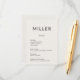 This architectural 5x7 wedding details card features a clean minimalist layout with a bold surname header and a dual-sided modular format.