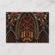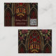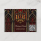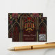 Arco gótico con calaveras. Un gran arco gótico se alza majestuosamente sobre un fondo rojo misterioso y profundo, decorado con detalles ornamentales. Los dos grandes pilares, adornados con delicados tallados, dan a la imagen una elegancia conmovedora. En el centro del arco brilla una impresionante vidriera, cuyo motivo central es una araña, símbolo de paciencia y creatividad. Rodeado por dos cráneos dorados, que recuerdan tanto a la transitoriedad como al amor eterno, el arco cautiva al espectador y promete una celebración llena de misterio y fascinación.