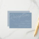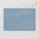 Una pequeña tarjeta para el recinto de la invitación a la boda para los detalles de la recepción, con "Recepción" en la parte superior con letras cursivas y los detalles de la recepción alineados en la parte inferior derecha. Diseñado para coincidir con nuestra colección de bodas Script Watermark. Nuestro colorante Dusty Blue es una elegante mezcla de azul etéreo, con letras blancas y azules-grises sobre un polvoriento fondo azul medio.