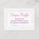 ¡Estos adorables boletos de Diaper Raffle son la actividad perfecta de Baby Shower! Simplemente inserte uno junto con su Invitación de Baby Shower. Los huéspedes anotan su nombre en el boleto de Diaper Raffle y traen un paquete de pañales (de cualquier tamaño) para una oportunidad de ganar un premio! ¡Una gran manera para que mamá-en-venir haga sus reservas en algunos pañales muy necesarios mientras aloja una divertida rifa de Baby Shower! El diseño es adorable y cuenta con coloridos rociadores de arcoiris con acentos rosas para una niña que roce.