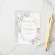El diseño de esta tarjeta de recepción de boda se compone de un marco de color marrón, verde salvia claro y flores secas azules con un fondo de color blanco o de papel. La parte posterior es un bonito lavabo azul acuarela. Esta tarjeta es parte de la suite de tarjetas Blue Dried Boho Flowers creada por Simply Farmhouse Press.