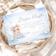 A sweet and dreamy baby shower design featuring an adorable bunny surrounded by soft blue florals and delicate butterflies. The gentle watercolor background in pastel blue tones creates a calm nursery aesthetic, while the floral details add a romantic and storybook charm. A tiny bow and tutu give the bunny an extra adorable touch, making the design perfect for a soft, elegant celebration. Ideal for a blue themed baby shower with a whimsical woodland feel.