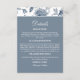 Add a touch of timeless elegance to your special day with this personalized Chinoiserie Christian Wedding details card, thoughtfully designed to complement a Vintage Floral Wedding theme. This stylish wedding enclosure card features delicate dusty blue flowers, graceful leaves, and whimsical butterflies set against a crisp white background, evoking the charm of a botanical garden in full bloom. The design showcases your wedding information in a refined mix of classic calligraphy script and modern serif font with a meaningful bible verse on the back, all set against a soft dusty blue backdrop. Inspired by the romantic Toile de Jouy style, this wedding details card blends French sophistication with a fresh, contemporary look. Perfect for including accommodation details, directions, or any important information your guests need to know, this enclosure card is both beautiful and functional — a seamless addition to your elegant garden-inspired, God-centered wedding suite.