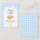 This charming diaper raffle enclosure card is designed as a coordinating insert to include with baby shower invitations. It features a cozy illustrated apple pie on a soft blue gingham background accented with delicate white floral details and a sweet coquette bow at the top. Elegant script typography highlights the title “Diaper Raffle,” while the clear message below encourages guests to bring a pack of diapers (any size) for a chance to win a prize. Perfect for pie-themed or bakery-inspired baby showers, this timeless pastel insert adds a fun and practical activity to your celebration and can be used for events held in any season.