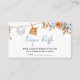 Haz que tu ducha de bebé sea aún más deliciosa con nuestra tarjeta de pañales Baby Shower para calabaza pequeña Impresora. Adornada con adorables motivos para el bebé, esta tarjeta de personalizable le da un toque de dulzura a su evento. Animar a los huéspedes a participar en la diversión y añadir un toque práctico a su celebración. ¡Simplemente personaliza la emoción de la rifa de pañales! BS1109