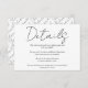 Tarjeta de gabinete boda blanco y negro de caligrafía de escritura moderna. Un elegante diseño minimalista de boda en blanco y negro con la palabra "Detalles" en caligrafía de guión. La parte posterior incluye un patrón en blanco y negro de sus nombres. Tenga en cuenta que si sus nombres en la parte posterior toman más o menos espacio personalizar para aumentar o disminuir el tamaño del texto en consecuencia.