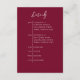 Tarjeta de gabinete de detalles de boda con un escaneado código QR y cronología, con un fondo de color burdeos, con nuestros bodas del sitio web, con una caligrafía mínima y elegante perfecta para detalles e información de la recepción de bodas.