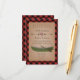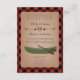 Una tarjeta de recepción de boda rústica que presenta una ilustración de un corazón entre dos flechas. Canoa verde en la parte inferior. El fondo es de cuadros rojos y negros.