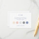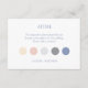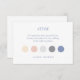 Esta elegante tarjeta de vestimenta tiene 5 puntos de color: azul polvoriento de la moda, rosa rosa rosa rosa negro, melocotón crema pastel y 2 tonos grises. El fondo, tanto delantero como trasero, es un blanco resplandeciente.