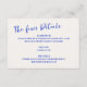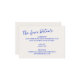 Extravagante y divertido boda detalles tarjeta de gabinete con letra manuscrita casual en color azul cobalto en crudo.