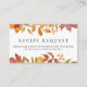 Esta carta de solicitud de receta de personalizable incluye una garganta acuarela de foliaje otoño en tonos cálidos como el óxido, el ámbar y el verde oliva. Es una manera muy cuidadosa de invitar a los huéspedes a compartir una receta favorita en su evento temático de otoño, ya sea un boda, una ducha de novia, una ducha de bebé o una reunión familiar. Personaliza la tarjeta con tu propio mensaje e instrucciones para que coincida con tu tono y tema. El diseño inspirado en el otoño aporta un toque acogedor de temporada y complementa las celebraciones rústicas, caseras o de inspiración natural. Incluirla con invitaciones o repartirla en su evento para recolectar conservas de recetas significativas y personales.