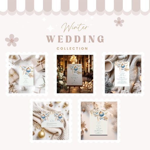 Un diseño minimalista y elegante con Navidades azules esmerilados colgando de ramas de pino dorado. La paleta vintage de invierno y los suaves detalles acuáticos crean un ambiente boda de vacaciones refinado y romántico con un toque de boho.