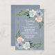 Tarjetas de inserción de boda de melocotón rosa dorado azul polvoriento: el diseño presenta un fondo azul polvoriento de acuarela con un marco dorado recortado en eucalipto y vegetación con elementos florales en gris/blanco, azul polvoriento y rosa melado/melonada.