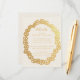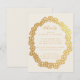 Una tarjeta de detalles del boda con el texto encerrado en un marco floral rugoso, una flor de Relieve metalizado de oro falsa. El texto es dorado, como el marco floral. Los detalles del título están escritos en guión, el resto en mayúsculas. El fondo es marfil (casi blanco). La guirnalda floral es de la vieja portada del libro de 1895 "Las zanjas" de la Sra. Molesworth, ahora de dominio público.