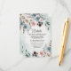 El diseño presenta elegantes acuarelas florales en tonos marfil, beige, rosa oscuro, malva, diferentes tonalidades de azul polvoriento y más. El diseño también presenta varios tipos de vegetación y ramas con salpicaduras de color azul polvoriento en las esquinas para añadir estilo.