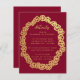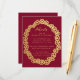 Una tarjeta de detalles del boda con el texto encerrado en un marco floral rugoso, una flor de Relieve metalizado de oro falsa. El texto es dorado, como el marco floral. Los detalles del título están escritos en guión, el resto en mayúsculas. El fondo es rojo intenso (un borgoña rojizo). La guirnalda floral es de la vieja portada del libro de 1895 "Las zanjas" de la Sra. Molesworth, ahora de dominio público.