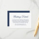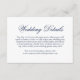 Tarjeta tradicional boda con la palabra "detalles" en una caligrafía elegante. Todo el texto está en azul marino sobre un fondo blanco y puede cambiarse a cualquier color que desee haciendo clic en el botón "personalizar". Utilice estas tarjetas para proporcionar instrucciones y cualquier otro detalle importante de los bodas que sus huéspedes puedan necesitar, como alojamiento en el hotel, aparcamiento, información de transporte, etc. Este diseño clásico es perfecto para un boda formal.