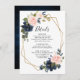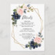 Tarjeta de detalles de boda geométrica floral azul marino oscuro con elegante ramo de azul marino, azul real, blanco, rosa rubor y hojas de eucalipto verde salvia y elegante marco geométrico neutro con brillo. Por favor, contácteme para cualquier ayuda en personalización o si necesita cualquier otro producto con este diseño.