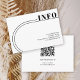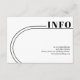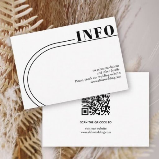 Esta elegante tarjeta de inclusión en blanco y negro para bodas muestra un arco chic y simple junto con tipografía moderna. El diseño destaca un marco arqueado horizontal y una línea curva que incorpora inteligentemente la palabra "INFO" que se extiende hacia el lado derecho. En el reverso de la tarjeta, se incluye un código QR para proporcionar acceso fácil a todos los detalles necesarios de la boda para los invitados.