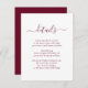 Proporcione a sus invitados con detalles importantes con esta elegante tarjeta de inclusión de boda moderna de borgoña con una fuente de escritura moderna. Artículos coincidentes disponibles.