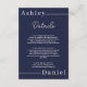 Esta elegante tarjeta de gabinete con detalles de boda azul marino es perfecta para un boda moderno. el diseño es sencillo, con una elegante caligrafía blanca sobre un fondo azul marino.
