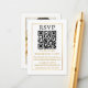 Tarjeta RSVP de boda simple Minimalista moderna con tu código QR. Marco dorado. Blanco y negro con texto dorado. Foto de vuelta.