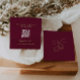 Tarjeta RSVP de bodas de Borgoña y de Chartreuse con un código QR y un ilustracion de bolsillo de monograma en la parte posterior.