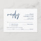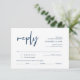 Esta es la hermosa caligrafía romántica moderna, Tarjeta de Gabinete RSVP (Respond), en la fuente azul marino, donde puedes editarla, cambiarla de color y formatearla según tus necesidades de diseño, con opciones de comida, asientos reservados, número de asistentes y opción de petición de canciones. Teesha Derrick