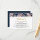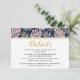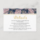 Tarjeta de inserción de detalles de boda con hojas tropicales en rosa, azul marino y dorado. Un diseño hermoso que muestra hojas de filodendro de hoja hendida (Monstera deliciosa) o planta de queso suizo y hojas de palma en rosa pálido con contorno dorado. El fondo es de color azul marino. La parte posterior está cubierta con un patrón de lunares dorados sobre azul marino.