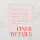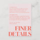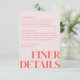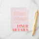 La tarjeta de diseño de Belmont muestra una tipografía grande que dice "detalles más finos". Al mirar arriba, los detalles esenciales de la celebración se presentan elegantemente en una pequeña fuente serif clásica.