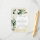 El diseño de esta tarjeta de detalles bodas presenta una hermosa y exuberante vegetación tropical y flores blancas sobre un suave fondo de color amarillo arena. Perfecto para el destino o la boda en la playa. Creado por Simply Farmhouse Press.