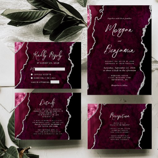 Burgundy Silver Agate Chic Script Wedding SuiteDiseñado por Akhates Designs