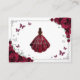 Burgundy, silver and white Quinceanera reception details enclosure cards. Features brunette girl in ball gown dress, script font, silver butterflies, dark red roses and tiara. Perfect for an elegant princess style glam celebration. Personalize with your own details.