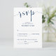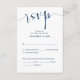 Esta es la hermosa caligrafía elegante boda moderna, tarjeta de gabinete RSVP (Respond), en la fuente azul marino, donde puedes editar, cambiar el color y formatearlo según tus necesidades de diseño, con opciones de comida, asientos reservados, número de asistentes y opción de petición de canción. Teesha Derrick