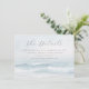 This wedding enclosure card features a serene beach scene with gentle waves, creating a calming oceanic atmosphere. The color palette is dominated by soft blues and whites, evoking a sense of peace and relaxation. Elegant script typography at the top adds sophistication, while classic serif fonts provide clear instructions for accessing more details online. The design's balanced layout and ample negative space ensure readability, making it perfect for guiding guests to further information about the wedding.