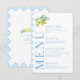 Con esta sofisticada y pulida tarjeta de menú podrá realzar el encanto de su romántica celebración de bodas de temática italiana mediterránea. Con un intrincado azulejos azul claro adornado con delicadas ramas de limón decoradas con brillantes flores azules, este bonito diseño se eleva con personalización, mostrando los nombres de la novia y del novio en la parte de atrás.
