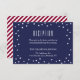 Tarjeta de recepción azul marino con un toque de estrellas y una parte posterior a rayas blancas y carmesí.