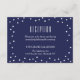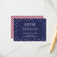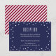 Tarjeta de recepción azul marino con una lluvia de estrellas y un dorso a rayas blancas y carmesí.