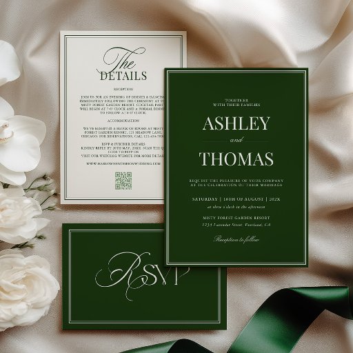 Refined, timeless, and effortlessly elegant, this wedding details card features a rich old-money dark green paired with a soft ivory background. The clean typography and classic border design evoke understated luxury—perfect for couples drawn to heritage style, quiet sophistication, and enduring romance.